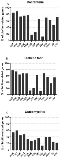 - Yu, S.; Jiang, B.; Jia, C.; Wu, H.; Shen, J.; Hu, X.; Xie, Z. Investigation of biofilm production and its association with genetic and phenotypic characteristics of OM (osteomyelitis) and non-OM orthopedic Staphylococcus aureus. Ann. Clin. Microbiol. Antimicrob. 2020, 19, 1–9. [Google Scholar] [CrossRef]