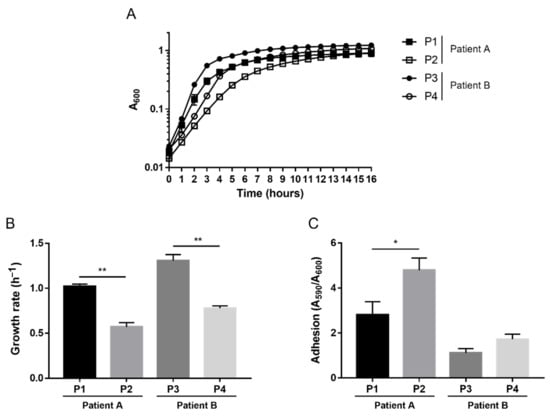 To investigate possible phenotypic variations within the same host over time, we evaluated features such as growth rate and adhesion, which are known to often undergo modifications during bacterial adaptation into the CF lung. We previously observed that no significant changes in terms of growth rate and adhesion ability occurred over time within the longitudinal Achromobacter spp. isolates from the two patients [36]; growth curves are shown in Figure S2. On the contrary, P. aeruginosa isolates underwent the phenotypic evolution known to occur during CF chronic infection: the growth rate significantly diminished over time in both patients, while the adhesion ability increased significantly in patient A (Figure 1).