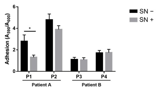 P. aeruginosa adhesion in the absence and presence of the co-isolated Achromobacter spp. culture supernatant (SN−, SN+). Adhesion was measured by crystal violet staining of surface-attached bacteria divided by A600 of planktonic bacteria. Each value represents the mean ± SEM of 3 experiments. Statistical analysis was performed by t-test, * p < 0.05.