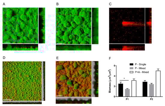 Single-species biofilms formed by P. aeruginosa P1 (A) and P2 (B) isolates, representative image of Achromobacter sp. biofilm structures (C), mixed biofilms formed by P1 + A1 (D) and P2 + A2 (E) strains and biomass quantification (F). Biofilms were grown in a flow chamber system for 5 days and monitored by confocal microscopy. P. aeruginosa isolates were tagged with GFP (green), and Achromobacter sp. cells were counterstained with Syto62 (red). P. aeruginosa biomass in single and mixed biofilms (P-Single, P-Mixed) and total biomass of mixed biofilms (P+A-Mixed) were calculated using Comstat2 software. Each value represents the mean ± SEM of 3 experiments. Statistical analysis was performed by the Mann–Whitney test, * p < 0.05.