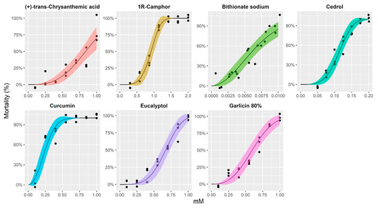 For compounds that showed 100% mortality only at 24 h (bitoscanate, coumarine, diallyl sulfide, and pyrethrins 50%), or 100% mortality already after 1 h with the highest concentration (1 mM; N,N-diethyl-M-toluamide, 4-hexylresorcinol, and monocrotaline) no second scaled down LC assay was performed.