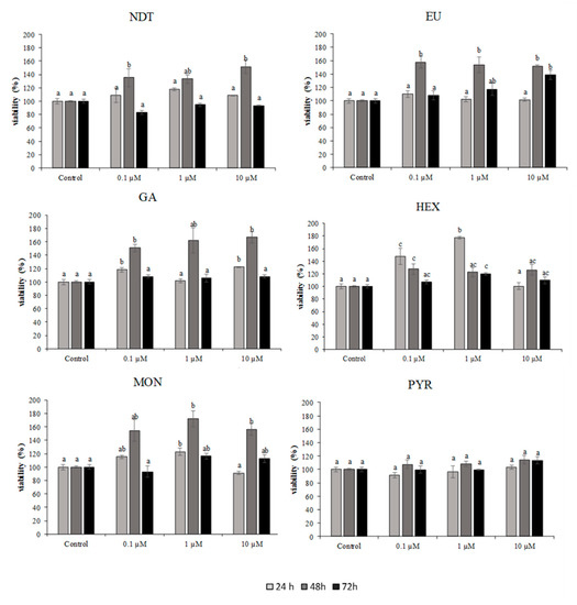 Cytotoxicity of SAF-1 cells exposed to different concentrations of natural and synthetic compounds (0.1–10 µM) for 24, 48, and 72 h. Bars represent the mean ± SEM (n = 6). Statistically significant differences (ANOVA; p < 0.05) were denoted using different superscripts letters (a, b, ab, c, ac). NDT: N,N-diethyl-M-toluamide; EU: eucalyptol; GA: garlicin 80%; HEX: 4-hexylresorcinol; MON: monocrotaline; and PYR: pyrethrins 50%.