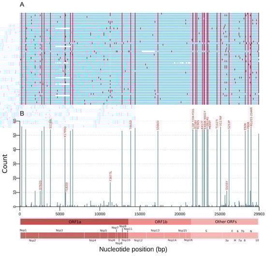 SNPs and insertions/deletions in each sample were identified using snippy variant calling and core genome alignment pipeline v4.6.0 (https://github.com/tseemann/snippy; accessed on 4 May 2021), which uses FreeBayes v1.3.2 [] to call variants and snpEff v5.0 [] to annotate and predict their effects on genes and proteins. Genome map and SNP histogram were generated after running MAFFT v7.475 [] alignment using the msastats.py script, and plotAlignment and plotSNPHist functions []. Sequence positions refer to GenBank RefSeq sequence (NC_045512.2), isolated and sequenced from an early case from Wuhan (China) in 2019.