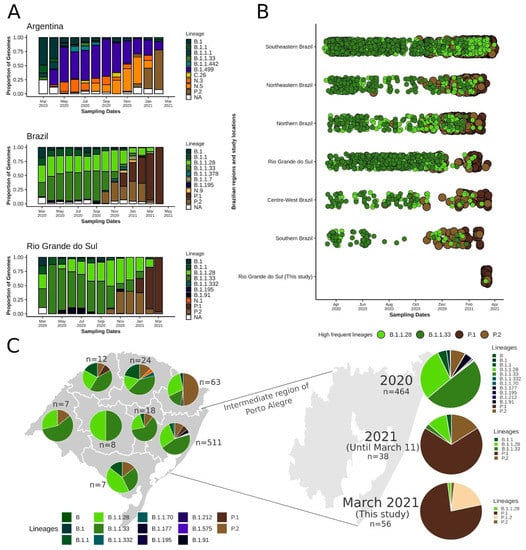 Distribution of SARS-CoV-2 lineages across time in Argentina, other Brazilian regions, and RS state. The other bordering country (Uruguay) was not included due to the limited number of samples available (n = 135). (A) Per month lineage distribution in Argentina, all of Brazil, and RS state. Only the 10 most prevalent lineages were considered. (B) Timeline showing the distribution of the most prevalent lineages until the end of 2020 (B.1.1.28 and B.1.1.33) and from the end of 2020 onward (P.1 and P.2) for the five Brazilian regions, RS state, and considering only this study (March 2021). (C) Map of RS state divided into eight intermediate regions, as defined by IBGE, displaying the proportion of the lineages in each area. The region of Porto Alegre was amplified and the lineage frequencies from 2020, 2021 and the present study are presented on the right. NA, other lineages.