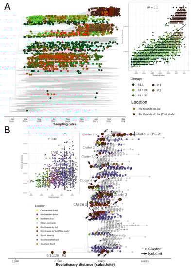 The time-resolved ML phylogenetic tree confirmed the PANGO lineages assigned, since 54 genomes (96.4%) grouped with P.1 representatives, 1 (1.8%) with B.1.1.28, and 1 (1.8%) with P.2 sequences. We also observed a strong correlation between genetic distances and sampling dates (R2 = 0.71). The P.1 sequences were grouped above the regression line, showing higher evolutionary rates than the other lineages in the SARS-CoV-2 phylogeny, as observed in other studies [,]. We highlighted the most abundant global lineages present in RS state that passed the quality control criteria (B.1.1 (n = 32), P.1 (n = 83), P.2 (n = 83), B.1.1.28 (n = 203), and B.1.1.33 (n = 286)). We also noticed the high abundance of B.1.1.28 and B.1.1.33 lineages until October and November 2020, followed by the rise and establishment of P.2 and P.1, respectively (Figure 3A).