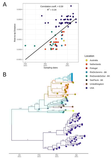 ML trees were inspected in TempEst v1.5.3 [] to investigate the temporal signal through regression of root-to-tip genetic divergence against sampling dates. For the P.1 ML tree, samples with missing days of the collection were filled with the 15th day of the month. ML and time-resolved trees were visualized using FigTree v1.4.4 (http://tree.bio.ed.ac.uk/software/figtree/; accessed on 4 May 2021) and ggtree R package v2.0.4 [].