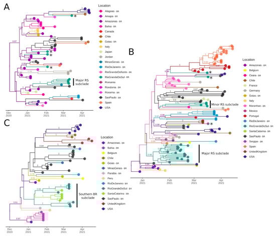 Bayesian discrete asymmetric phylogeographic analysis of the identified Clades 2–4 up to 26 April, 2021. (A) Clade 2: MCC tree of the 71 sequences included in this analysis. (B) Clade 3: MCC tree of the 122 genomes included in this analysis. (C) Clade 4: MCC tree of the 50 sequences included in this analysis. For all MCC trees, numbers above branches represent the posterior probability of each branch. Only posteriors > 0.5 are shown. Asterisks represent potential introductions in RS state and subclades cited in the text are indicated. Circles indicate countries outside Brazil and Brazilian states (BR suffix).