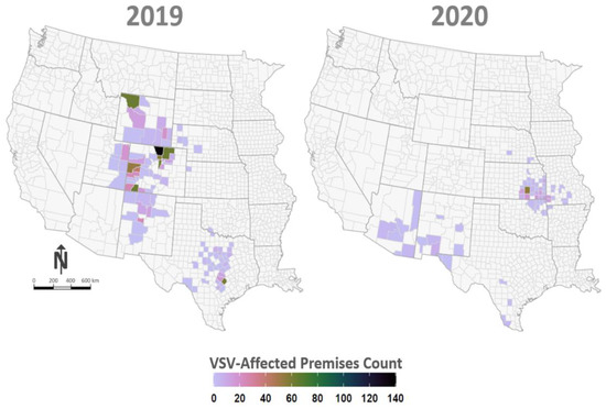 VSV-affected premises maps. Figure depicts the geographic location and number of VSV-affected premises by U.S. County. Panel at left displays VSV-affected counties documented in 2019 and panel at right shows counties recorded in 2020. Counties are color coded according to legend at bottom with darker tones (green colors) indicating relatively higher numbers of VSV-affected premises.