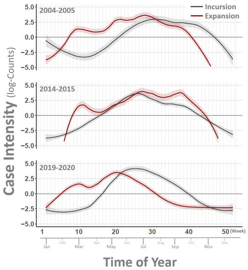 Estimated VSV case intensity. Figure compares incursion and expansion patterns for VSV outbreak cycles documented in 2004–2005 (top), 2014–2015 (center), and 2019–2020 (bottom). Vertical axes at left show case counts (logarithmic scale) and major horizontal axis lists week of year (Weeks 1–52) with approximate month of year displayed along minor horizontal axis. Curved lines represent smoothed counts of VSV-affected premises on the logarithmic scale. Shaded regions around curved lines signify the 95% Credible Interval for estimates. Dark gray line in each panel corresponds to incursion year estimates (2004, 2014, 2019) and red lines give expansion year estimates (2005, 2015, 2020). Note that outbreaks during expansion years tend to begin earlier in the year relative to incursion year outbreaks.