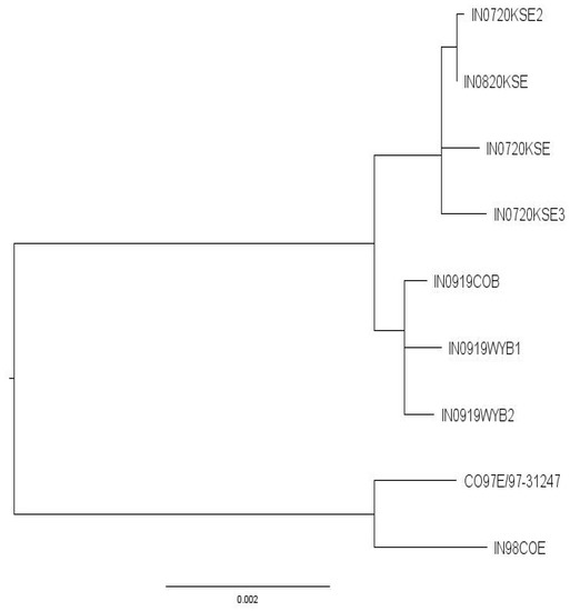 - Rambaut, A. (2006–2018). Fig Tree. Tree Figure Drawing Tool. Available online: http://tree.bio.ed.ac.uk/software/figtree (accessed on 15 June 2021).