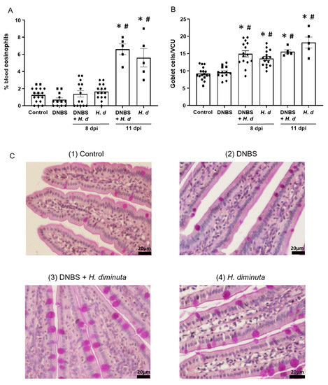 Colitis does not affect the hosts’ effector response to H. diminuta. Male BALB/c mice were treated with DNBS (3 mg, ir.) 3 days before infection with 5 cysticercoids of H. diminuta, and necropsied 8 or 11 days post-infection (dpi) (see Figure 3A), when blood eosinophils (A) and goblet cells in a section of mid-jejunum (B) were enumerated (data are mean ± SEM; n = 7–15 mice (pooled from 3 experiments) for 8-dpi and n = 4–5 mice for 11-dpi; one-way ANOVA and Tukey’s multiple; * and #, p < 0.05 compared to control and DNBS only, respectively; VCU, villus crypt unit; H. d, H. diminuta). Panel (C) presents representative photomicrographs of goblet cell (magenta) staining in jejunal villi.