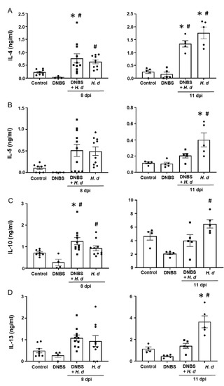 - Wang, A.; Fernando, M.; Leung, G.; Phan, V.; Smyth, D.; McKay, D.M. Exacerbation of oxazolone colitis by infection with the helminth Hymenolepis diminuta: Involvement of IL-5 and eosinophils. Am. J. Pathol. 2010, 177, 2850–2859. [Google Scholar] [CrossRef] [PubMed]