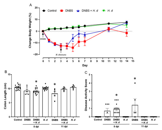 Infection with H. diminuta enhances recovery from colitis. Male BALB/c mice were treated with DNBS (3 mg, ir.) 3 days before infection with 5 cysticercoids of H. diminuta, and necropsied 8 or 11 days post-infection (dpi) (see Figure 3A). Body weight was recorded daily (A), and on necropsy colon length was measured (B) and disease activity score calculated (C) (data are mean ± SEM; n = 7–15 mice (pooled from 3 experiments) for 8-dpi; n = 4–5 mice for 11-dpi; parametric data analyzed by one-way ANOVA and Tukey’s multiple comparisons test and non-parametric data analyzed by a Kruskal–Wallis test with Dunn’s post-test; *, p < 0.05 compared to control; H. d, H. diminuta).