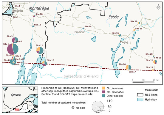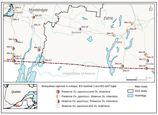 Given the current situation in neighboring Ontario, and knowing that the mechanical introduction of IMS through ground transportation is well documented even over long distances, the objective of this work was to assess, using an appropriate surveillance design, whether invasive Aedes spp. (Ae. albopictus and Ae. aegypti), could be or have been introduced mechanically in southern Québec. We also aimed to characterize the presence and abundance of other species already established in this region, including Oc. triseriatus and Oc. japonicus.