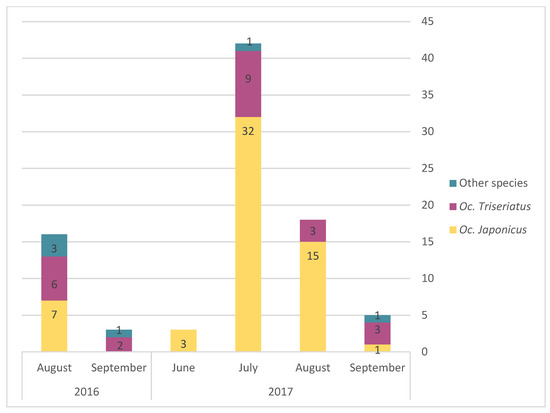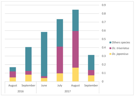 The monthly average abundance of adult mosquito peaked in August for both Oc. triseriatus and Oc. japonicus (Figure 3). Egg presence for the different AMOT species varied following similar temporal trends, but with a peak in July (Figure 4). However, we observed a slight difference in terms of the relative frequency for Oc. triseriatus and Oc. japonicus between August and September: the majority of eggs captured in September were Oc. triseriatus in 2016 and 2017, while the majority of eggs captured in June to August were Oc. japonicus in 2016 and 2017 (Figure 4). The relative frequency of eggs peaked one month earlier than adults for both species (Figure 4).