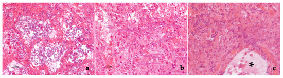 Foal. Pulmonary nodule. Several fungi were present inside the alveolar lumina (a), within necrotic-hemorrhagic foci (b) as well as in the blood vessel wall (black asterisk indicates the lumen of the same vessel). In some microscopic fields (b,c), dichotomous branching hyphae were seen. Hematoxylin and eosin stain. Final magnification 400×.