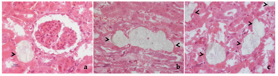 Foal. Kidney. Typical fan-shaped, oxalate crystals were seen in the lumina of renal tubules, both in transverse (a) and longitudinal (b) section (black arrowheads). The precipitation of oxalates affected most of renal tubules (c, black arrowheads), which appeared distended, their epithelium being no longer detectable (a–c). Hematoxylin and eosin stain. Final magnification 400×.