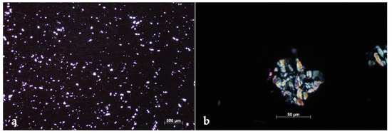 Foal. Kidney. At very low magnification, the precipitation of countless oxalate crystals was evident (a). At higher magnification, the typical birefringence, with radiating spokes, could be appreciated (b). Polarized light microscopy, hematoxylin and eosin stain. Final magnification 25× (a), 400× (b).