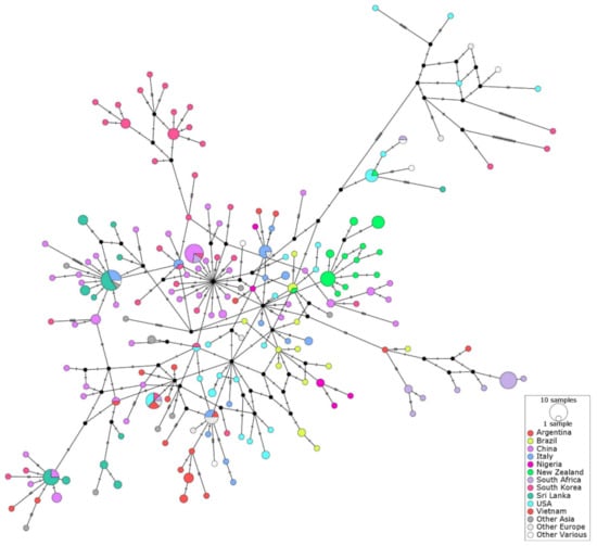 Limited genetic structure observed for CPV-2 sequences obtained from the same geographical location (Kandy, Matara, Colombo districts; Figure 3D) indicates that there were no strong barriers for CPV-2 spread between different geographical regions of Sri Lanka. This is supported by the clear structure in the network colored by a CPV-2 subtype (Figure 3A, Table 1), indicating that genetically similar CPV-2 sequences were mostly related to one another; hence, their detection in various parts of the country was likely to reflect the movement of the virus rather than independent local evolution. This is not surprising considering the frequent movement of people between districts and the extreme stability of CPV-2, with high potential for spread via fomites. The international network data (Figure 4) suggest that CPV-2 may also be moving relatively unhindered between different countries, which is indicated by the presence of multiple clusters comprising sequences of different geographical origin and supported by AMOVA results (Table 1).