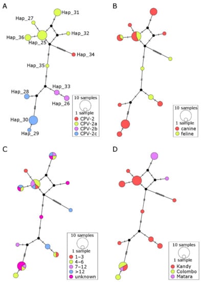 Median joining haplotype networks for characterizing the genetic structure amongst 31 Sri Lankan CPV-2 sequences did not correlate with the location of the veterinary clinic where the samples were submitted to the laboratory nor with the age group or type of the host from which the CPV-2 positive fecal samples were obtained (Figure 3, Table 1). There was, however, a clear structure in the network when samples were colored by the CPV-2 subtype (Figure 3A, Table 1).