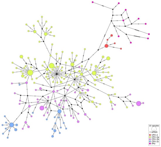 International haplotype network of CPV-2 viral protein 2 (VP2) sequences obtained from NCBI (n = 266) and those obtained in the current study (n = 31). The number of nucleotide substitutions between haplotypes is represented by ticks on branches. Nodes are scaled based on the number of representative sequences and coloured based on the CPV-2 subtype including feline panleukopenia virus (FPV). Inferred nodes are indicated with small closed black circles as they are not represented among sequences included in the network. Reticulation in a haplotype network indicates that the data did not contain appropriate signals to resolve a single pathway through a network, indicating that there is more than one possible sequence of mutation linking the associated haplotypes.