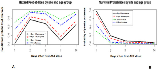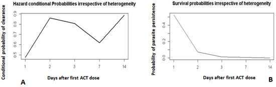 Hazard and survival probability profiles of the time effect on parasite clearance. Hazard conditional probabilities irrespective of heterogeneity (A). Survival probabilities irrespective of heterogeneity (B).