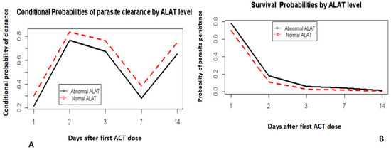 The ALAT levels in patients before treatment were correlated with time to parasite clearance (Figure 3A,B). Those with normal ALAT levels before treatment remained consistent with a higher chance of clearing their parasites for all the visit days on the condition that they did not clear the previous day of visit (Figure 3A). The probabilities of clearing parasites 2 days after treatment given that they were not cleared 1 day after treatment for normal and abnormal ALAT levels were 83% and 76%, respectively (Figure 3A).
