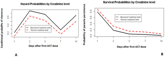 Lower time-to-clearance was also correlated in part with the participants’ creatinine levels before treatment (Figure 4A,B). Those with a normal creatinine level (within normal limits) had a lower chance of clearing parasites by each visit day given they had not cleared in the previous day than those with abnormal creatinine levels (below the normal limits).