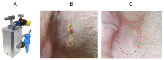 Intradermal inoculation into the neck. The Pulse 250 (needle-free system) intradermal machine (A). Photograph of the injection site at 1 h (B) and 3 days (C) post-intradermal inoculation into the neck muscle.