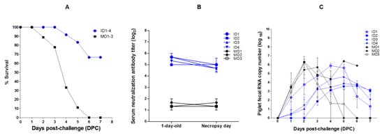 Survival, serum neutralizing antibody titer, and RNA copy number in piglets inoculated with virulent PEDV. Percentage survival (A), changes in serum neutralizing antibody titers (B), and PEDV RNA copy number in feces of piglets challenged with virulent PEDV (C). Piglets born to sows (nos. ID1, ID2, ID3, and ID4) inoculated intradermally with the PED vaccine plus the Carbopol 940 polymer adjuvant, and piglets born to mock group sows (nos. MO1, MO2, and MO3), are denoted by blue and black lines, respectively. Data represent the mean ± SEM.