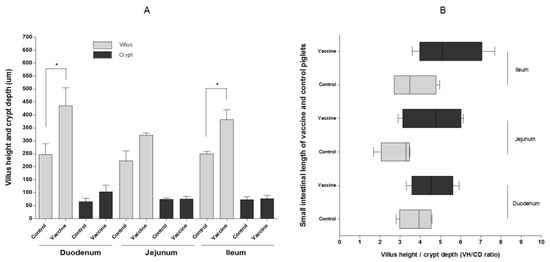 Necropsy of piglets challenged with PEDV showed significant vaccination-dependent differences in villus height (VH) in the duodenum and ileum (p < 0.05) (Figure 5A).
