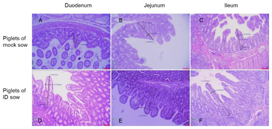 However, there was no difference in crypt depth (CD) in the duodenum, jejunum, and ileum between piglets of mock group sows and those of inoculated sows (Figure 5A). There was also no significant difference in the VH/CD ratio in the duodenum, jejunum, and ileum (Figure 5B). However, the small intestine epithelial cells in the duodenum and ileum of mock group piglets (Figure 6A,C) were more damaged than those of piglets (Figure 6D,F) from vaccinated sows.
