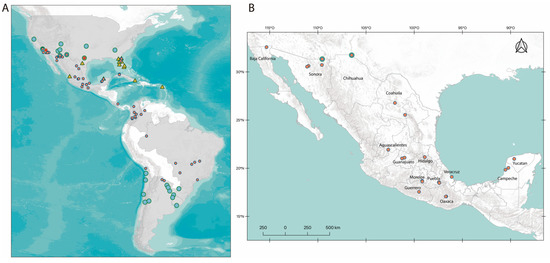 Distribution of Rhipicephalus sanguineus s.s. and R. sanguineus s.l. in the Americas. (A) Records of R. sanguineus s.l. in the Americas based on previously reports; shaded countries have at least one record. (B) Sampling done in this study throughout Mexico. Blue circles correspond to R. sanguineus s.s. and orange circles to R. sanguineus s.l. Tropical Lineage based on records of the 16S rDNA gene. Red hexagons correspond to R. sanguineus s.s. records with records from the literature using the 12S-rDNA gene sequences available in GenBank; similarly, yellow triangles correspond to R. sanguineus s.l. Tropical Lineage. A layer from ESRI Terrain was used to construct the figure (https://server.arcgisonline.com/ArcGIS/rest/services/World_Terrain_Base/MapServer/tile/{z}/{y}/{x}, accessed on 30 August 2021). A detailed list of localities is available in Supplementary File 1.