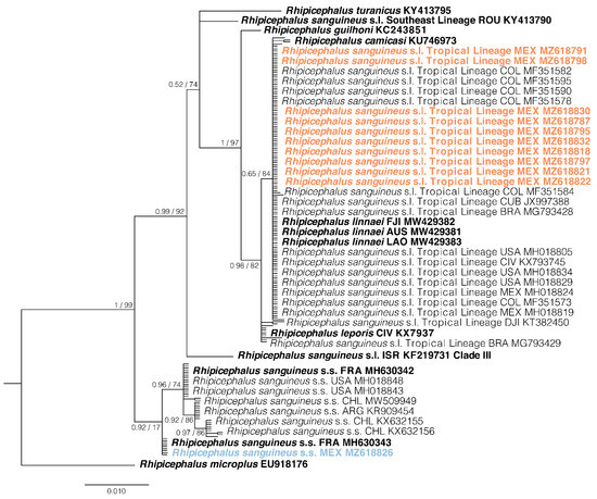 Bayesian Inference phylogenetic compress analysis of the 16S rDNA partial gene for Rhipicephalus sanguineus s.s. and Rhipicephalus sanguineus s.l. Tropical lineage from the Nearctic and Neotropical regions, as well as of a few selected genes from the Afrotropical, Australasian, and Oriental regions. The phylogenetic relationships were inferred based on the Hasegawa-Kishino-Yano (HKY85) with gamma distribution for a total of 372 bp. Branch labels show branch support at each node according to posterior probabilities/non-parametric bootstrap, from the BI and ML analyses, respectively. Orange and blue sequences correspond to sequences obtained in this study.