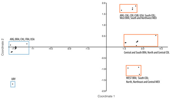 PCoA plot of the first and second coordinates based on the eigenvalue scale and Euclidean distances for the 191 sequences of Rhipicephalus sanguineus and Rhipicephalus sanguineus s.l. Tropical Lineage from the Americas used in this study. The proportion of total variance along the two coordinates were 84.094% and 7.0986%, the eigenvalues were 3435.9 and 290.04, respectively. Orange sequences correspond to R. sanguineus s.l. Tropical Lineage, and blue sequences to the R. sanguineus. We used the ISO 3166-1 alfa-3 code for the countries.