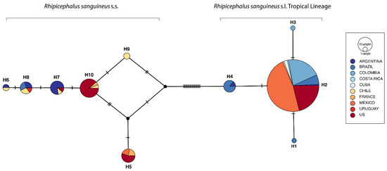 A total of 10 haplotypes were detected in the sequences from the Americas, with a haplotype diversity (Hd) of 0.4863 and a nucleotide diversity (π) of 0.0258. However, two groups could also be defined in the haplotype network, since 16 mutations divided the haplotypes into two groups: H1–H4 corresponded to the Tropical lineage, and the second group, formed by haplotypes H5–H10, corresponded to R. sanguineus s.s. Even though these two groups were well-supported, the H2 haplotype was the most abundant one of the networks, including samples from 8 of the 10 considered countries (80%), namely Argentina, Brazil, Chile, Colombia, Costa Rica, Cuba, Mexico, and the US. On the other hand, for the second group of haplotypes, no differentiation centre could be defined (Figure 4).