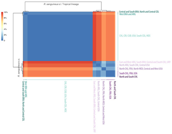 Heatmap of Nei’s genetic distances for Rhipicephalus sanguineus s.s. and Rhipicephalus sanguineus s.l. Tropical lineage from the Americas. Colour gradient represents the percentage of differentiation when comparing the 191 sequences according to the scale bar in the right.