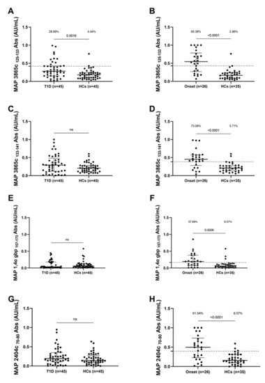 Prevalence of Abs against MAP antigens in Sardinian T1D children. Plasma samples from T1D patients, HCs and patients at T1D onset were tested against MAP 3865c 125–133 (A,B), MAP3865c 133–141 (C,D), MAP 1,4-α-gbp 157–173 (E,F) and MAP 2404c 70–80 (G,H) peptides. The dotted lines represent positivity thresholds calculated by ROC analysis; Mann–Whitney p-value and the percentage of positive patients evaluated by Fisher’s exact test are indicated in the upper part of each graph.