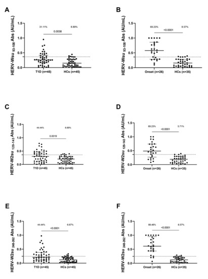Anti-HERV-Wenv 248–262 Abs were detected in T1D patients (44.44%, 20 out of 45) and in HCs (6.67%, 3 out of 45) (cut-off value of 0.24; AUC = 0.73; p < 0.0001, Figure 2E); in patients with onset of T1D 88.46%, 23 out of 26) and in HCS (8.57%, 3 out of 35) (cut-off value 0.24; AUC = 0.95; p < 0.0001, Figure 2F).
