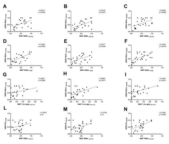A low correlation was observed between MAP 1,4-α-gbp 157–173 and HERV-Wenv 93–108 (r = 0.43, p = 0.03, Figure 3G), and between MAP 1,4-α-gbp 157–173 and HERV-Wenv 248–262 (r = 0.44, p = 0.002, Figure 3I), while a moderate correlation between MAP 2404c 70–80 and HERV-Wenv 129–143 (r = 0.58, p = 0.002, Figure 3H).