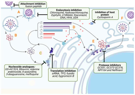 FCoV life cycle and mechanisms of actions of current FIPV antivirals. Letters A–F represent major steps of FIPV replication: (A) Attachment to cell and endocytosis. (B) Liberation of Ribonucleocapsid following fusion of viral and cell membranes and decapsidation. (C) Transcription of viral RNAs and creation of Replication/Transcription Complex. (D) Translation of the viral structural proteins. (E) Assembly of virion in the endoplasmic reticulum or Golgi apparatus. (F) Budding of virus in the ERGIC and exocytosis. HHA: Hippeastrum hybrid agglutinin; UDA: Urtica dioica Lectin; GNA: Galanthus nivalis agglutinin; TFO: Triple Helix Forming Oligonucleotides. Created with Biorender.