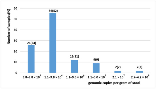 The viral load was determined in the 107 BuV-positive stool samples collected from 92 patients and ranged from 3.8 × 103 to 4.2 × 108 genome copies per gram of stool (or per mL of 15% fecal suspension), with mean and median values of 7.1 × 106 and 2.8 × 104 genome copies per gram of stool (Figure 1). Previous studies reported values that were lower in stool samples [9,18,19], with values ranging between 2.1 × 102–1.6 × 103 [9] and 1.9 × 103–3.2 × 104 [18] copies/mL of 10% fecal suspension. In addition, 23.4% (25/107) of our samples had a viral load ≥1.1 × 105 genome copies per gram of stool. Previous studies showed other viruses causing gastroenteritis displayed similar viral loads. For instance, a report on children with gastroenteritis found that the adenovirus median viral load was 4.56 × 103 genome copies per gram of stools (range 2.14 × 102–1.32 × 105) [22]. Another study on patients with gastroenteritis showed that norovirus G1 median viral load was 8.4 × 105 genome copies per gram of stools (range: 2.2 × 104–2.9 × 1010) [23]. These data suggest that BuV might be a diarrhea-causing virus in some patients who should be identified in specific studies.