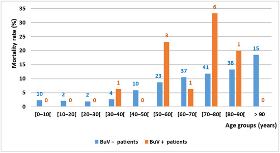 Mortality rate by age group and BuV DNA status in Marseille (3 months after stool sample collection). The number above each column indicates the number of deceased patients.