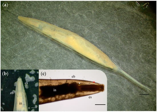 Female adult specimen of Protozoophaga obesa. (a) Whole specimen´s body on a dark-ground stereomicroscope image. (b,c) Anterior end; notice oesophagus (es), subtle bulge of the nerve ring (red arrowhead), isthmus of oesophagus (white arrowhead), oesophagus bulb (eb), and intestine (in). Scale bars: (a,b) 200 µm; (c) 50 µm.