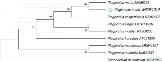 - Lee, S.-U.; Huh, S.; Sohn, W.-M. Molecular phylogenic location of the Plagiorchis muris (Digenea, Plagiorchiidae) based on sequences of partial 28S D1 rDNA and mitochondrial cytochrome C oxidase subunit I. Korean J. Parasitol. 2004, 42, 71–75. [Google Scholar] [CrossRef]