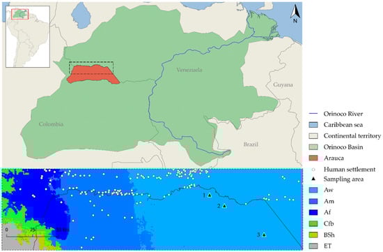 Precise geographic location of sampling areas; Aw: Tropical savanna, Am: Tropical monsoon, Af: Tropical Rainforest, Cfb: Oceanic, BSh: Semiarid, and ET: Tundra. (1) La Maporita, (2) Cinaruco, and (3) Bocas del Arauca.