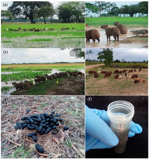 Illustration of free-ranging capybaras (Hydrochoerus hydrochaeris) in floodable savannas of the Orinoco Basin. (a) Twenty-seven capybara hare resting in Bocas del Arauca mudflats, notice the tight interaction with Charadiiform wader birds (Vanellus chilensis) (white arrowheads); (b) Small riverside group of capybaras sharing their habitat with spectacled caiman (Caiman crocodilus), red arrowhead indicates feces; (c) Twenty-three capybara hare in La Maportia, yellow arrowhead indicates feces; (d) Peridomestic chickens (Gallus gallus domesticus) and synanthropic capybaras feeding in close proximity demonstrating domestic animal–wildlife–human interface; (e) Freshly defecated capybara manure pellets piles; and (f) EtOH preserved capybara feces.