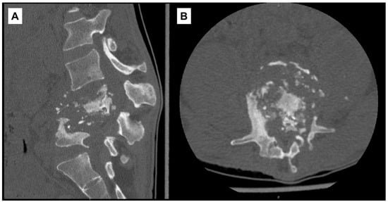 Computed-tomography scan of lumbar spine with diffuse destruction of L4–L5 vertebral bodies. (A) Sagittal view. (B) Axial view at L4 vertebral level.