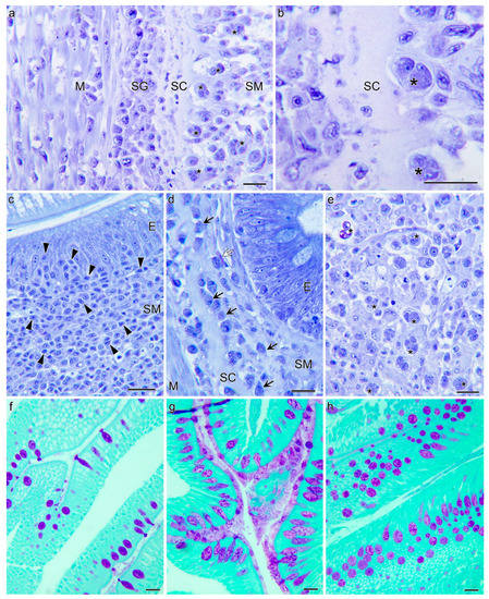 Intestinal histopathology of resistant steelhead trout exposed to Ceratonova shasta. At 21 days post exposure (dpe) (a,b,e) parasite stages (asterisks) present in the intestinal submucosa (SM) reach the stratum compactum (SC) but do not invade the underlying stratum granulosum (SG) and muscularis (M). Note that the lamina propria-submucosa is invaded by the parasite and has lost its tissue structure (e). Inflammatory cell proliferation and infiltration at 7 dpe consisting of lymphocyte-like cells (c). Cluster of granulocytes (black arrows) including one evident eosinophil (white arrow) in the submucosa at a 60 dpe (d). Mucins stained with periodic acid Schiff (PAS) (magenta) in 7 dpe (f), 21 dpe (g) and 60 dpe (h) intestines. Note the high abundance of PAS+ goblet cells at the two latter time points. Giemsa staining (a–e). Scale bars = 20 µm. E; epithelium.