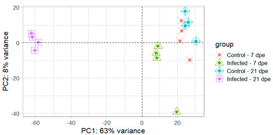 The sequencing of intestinal mRNA from resistant fish at 7 and 21 dpe generated 519 million single-end reads. The percentage of reads that could be uniquely mapped to a single locus in the rainbow trout genome varied between groups, ranging from 40.4% to 75.4% (Table 1). Principal component analysis showed a high degree of uniformity between samples within a group and clearly separated infected fish from uninfected controls with the first principal component explaining 63% of the total variation (Figure 4). Hierarchical clustering also clearly separated the infected samples from 21 dpe (Figure 5) and all the samples showed a high degree of correlation (r > 0.96), suggesting no outliers were present.